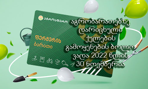 აგრობარათებზე დარიცხული ქულების გამოყენების ბოლო ვადა 2022 წლის 30 ნოემბერია, აღნიშნული ვადის ამოწურვის შემდეგ ფერმერები სახელმწიფო პროგრამით ვეღარ ისარგებლებენ, - ინფორმაციას აღნიშნულის შესახებ სოფლის განვითარების სააგენტო ავრცელებს.