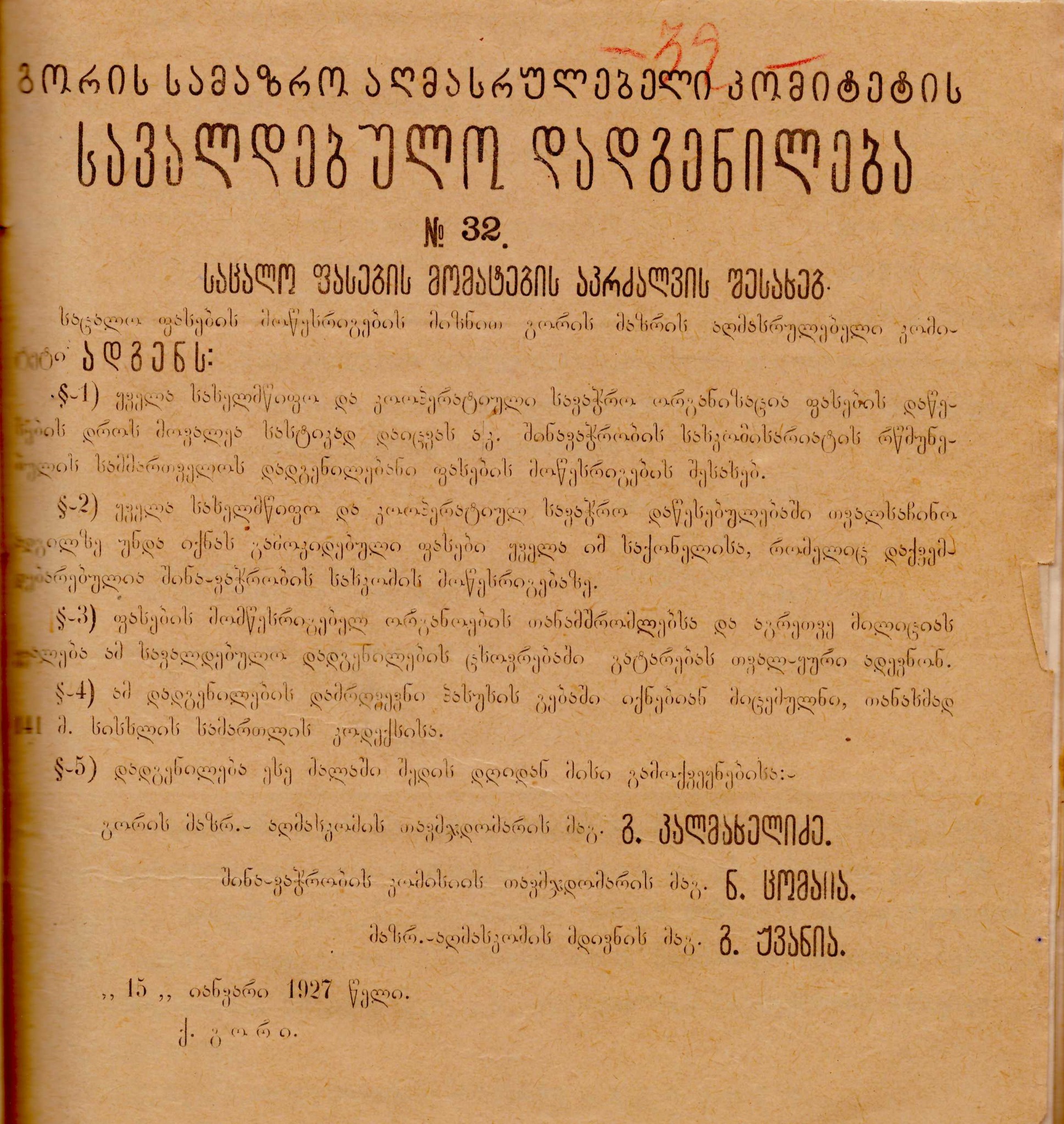 აღნიშნულმა კომისიამ 1927 წელს გამოსცა სავალდებულო დადგენილება ფასების მომატების აკრძალვაზე.