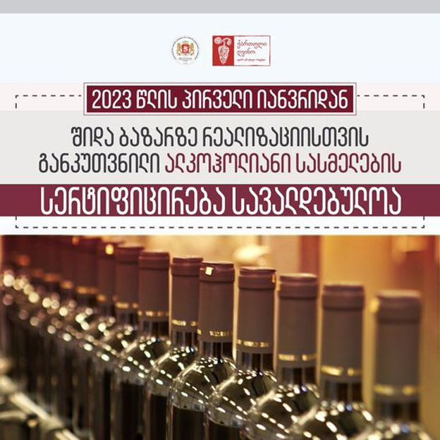 2023 წლის 1 იანვრიდან შიდა ბაზარზე რეალიზაციისთვის განკუთვნილი ალკოჰოლიანი სასმელები სავალდებულო სერტიფიცირებას ექვემდებარება.