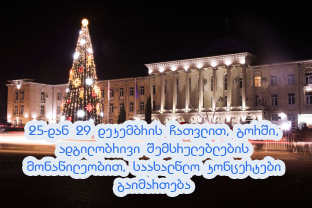 25 დეკემბრიდან 29 დეკემბრის ჩათვლით, გორის ცენტრალურ მოედანზე, ადგილობრივი შემსრულებლების მონაწილეობით საახალწლო კონცერტები გაიმართება.