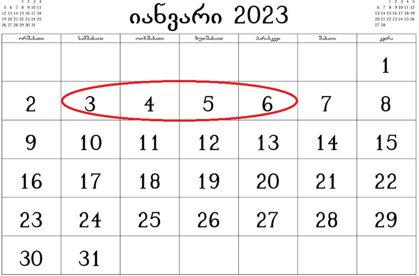შეგახსენებთ, პრემიერ-მინისტრის გადაწყვეტილებით, ადმინისტრაციულ ორგანოებში დასაქმებულთათვის 2023 წლის 3 იანვრიდან 6 იანვრის ჩათვლით დღეები უქმეებად განისაზღვრა.
