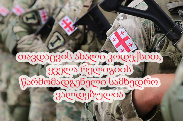 თავდაცვის ახალი კოდექსით, დისკრეციული პირობებით სარგებლობის შესაძლებლობა არცერთ კონფესიას ექნება, ყველა რელიგიის წარმომადგენელი სამხედრო ვალდებულია, - აღნიშნულის შესახებ საქართველოს თავდაცვის მინისტრის მოადგილემ განაცხადა.