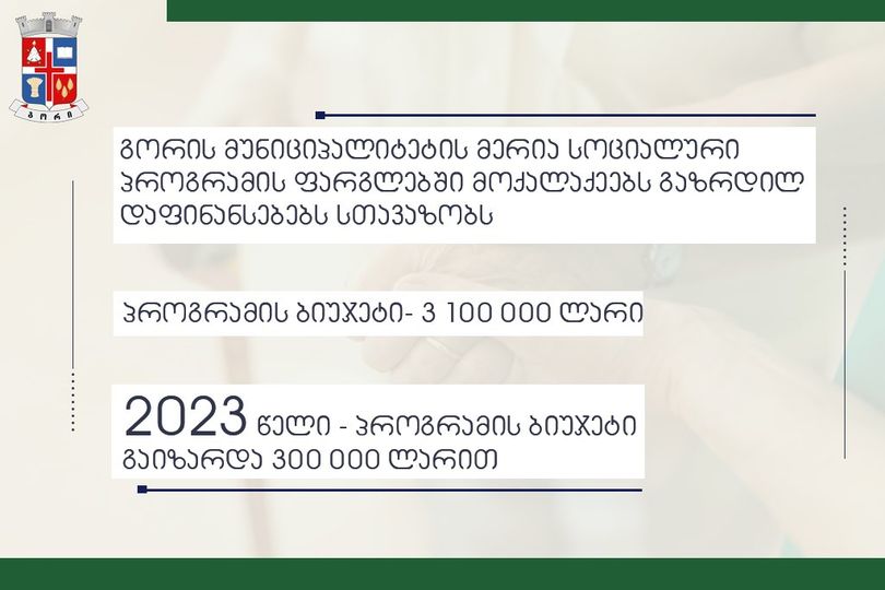 2023 წელს, გორის მუნიციპალიტეტის სოციალური პროგრამის ზოგიერთი მუხლით გათვალისწინებული დაფინანსებები გაიზრდა, ზოგიერთ მუხლს კი მოსარგებლეთა კატეგორიები დაემატა, - აღნიშნულის შესახებ ინფორმაციას ადგილობრივი თვითმმართველობა ავრცელებს.