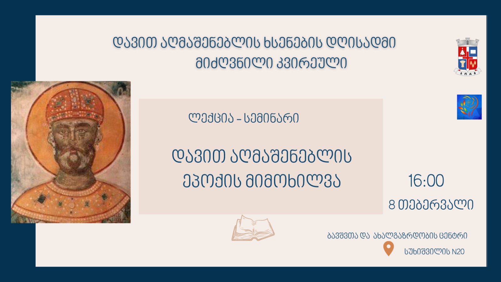 კვირეული, 16:00 საათზე ბავშვთა და ახალგაზრდობის ცენტრში სემინარით - „დავით აღმაშენებლის ეპოქის მიმოხილვა“ გაიხსნება. ასევე, მოეწყობა თემატური ნახატების გამოფენა და ისტორიის მოყვარულთა კონკურსი.