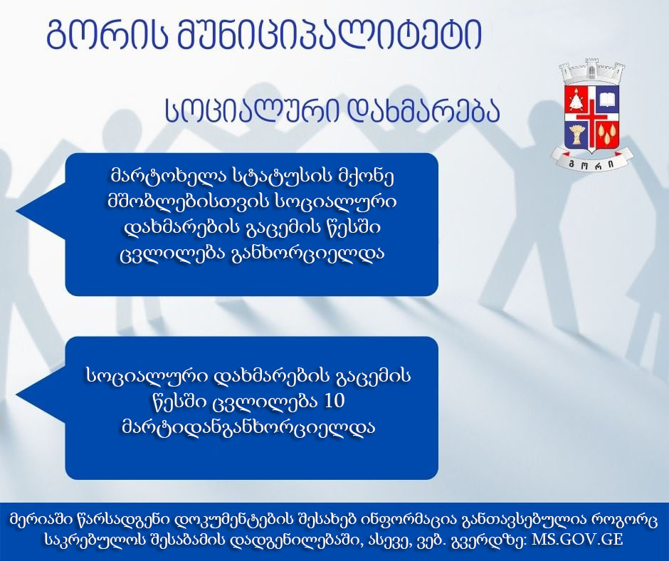 შეგახსენებთ, დახმარების მისაღებად დაინტერესებულმა პირებმა წერილობით უნდა მიმართონ გორის მერიას. მერიაში წარსადგენი დოკუმენტების შესახებ ინფორმაცია განთავსებულია როგორც საკრებულოს შესაბამის დადგენილებაში, ასევე, ვებ. გვერდზე: MS.GOV.GE