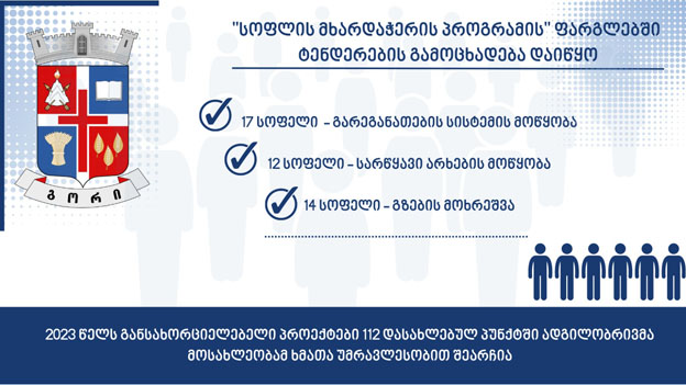 „სოფლის მხარდაჭერის პროგრამის“ ფარგლებში, გორის მუნიციპალიტეტის მერიამ, სარწყავი არხების მოწყობის და დასახლებულ პუნქტებში გზების მოხრეშვის მიზნით, ტენდერი გამოაცხადა.