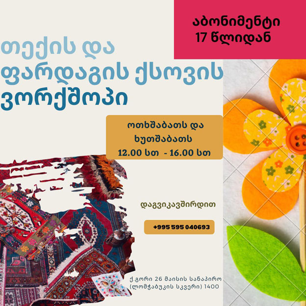 რაც შეეხება ვორქშოპებს, 17 წლიდან ზემოთ მოქალაქეებს შესაძლებლობა აქვთ, დაეუფლონ თექას და ფარდაგის ქსოვის ტექნიკას, შესძინონ ახალი, თანამედროვე ელფერი.