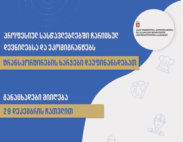 სახელმწიფო პროფესიულ საგანმანათლებლო დაწესებულებებში ჩარიცხულ იძულებით გადაადგილებულ პირებს, სწავლის პერიოდში, ტრანსპორტირების ხარჯები დაუფინანსდებათ, - ინფორმაციას დევნილთა, ეკომიგრანტთა და საარსებო წყაროებით უზრუნველყოფის სააგენტო ავრცელებს.